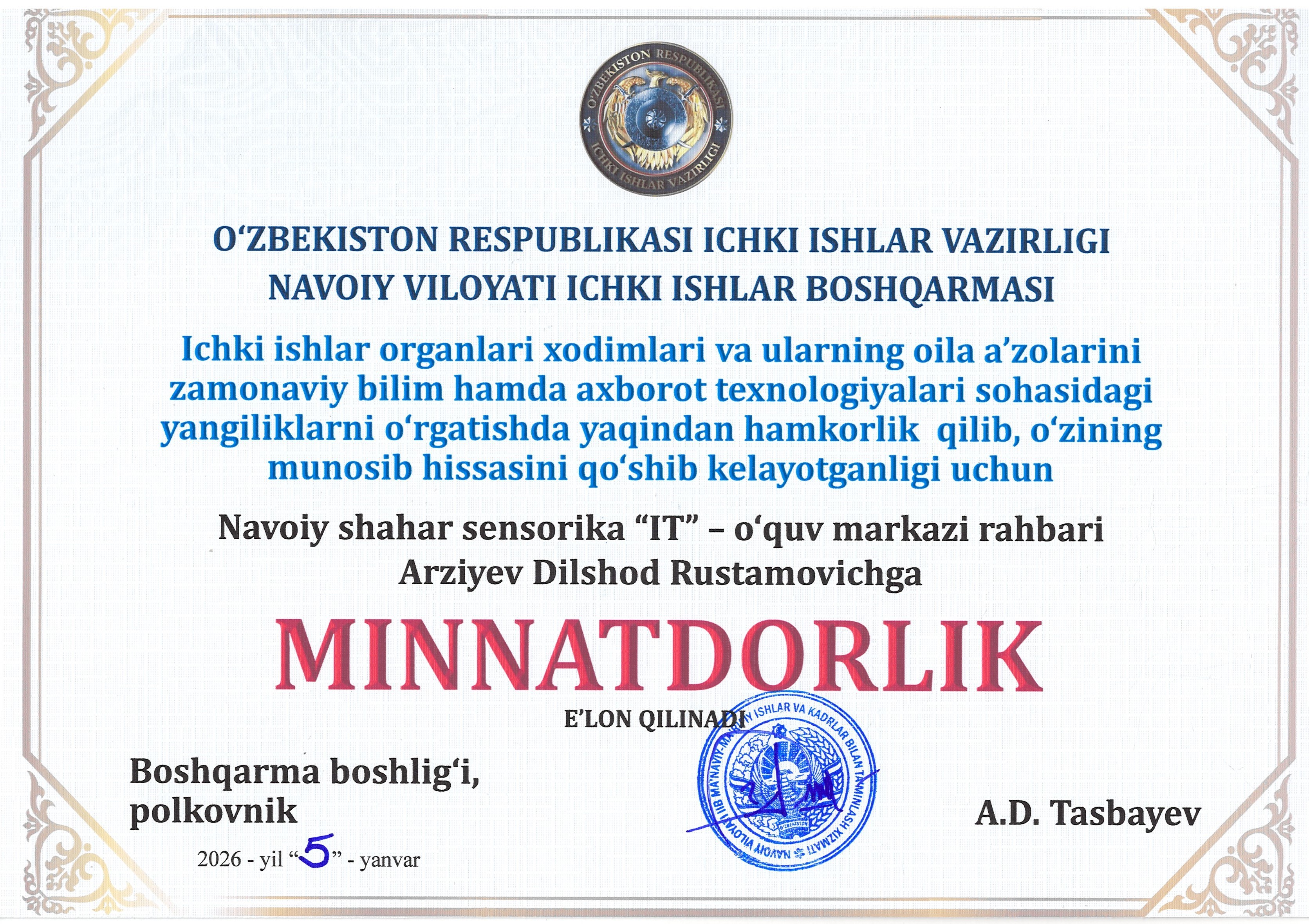 🎖 Munosib e’tirof! Tadbir yakunida zamonaviy bilim hamda axborot texnologiyalari sohasidagi yangiliklarni o‘rgatishda yaqindan hamkorlik qilib, o‘zining munosib hissasini qo‘shib kelayotganligi uchun Dilshod Rustamovichga Navoiy viloyati IIB boshlig‘i A.D.Tasbayev tomonidan MINNATDORLIK e’lon qilindi.